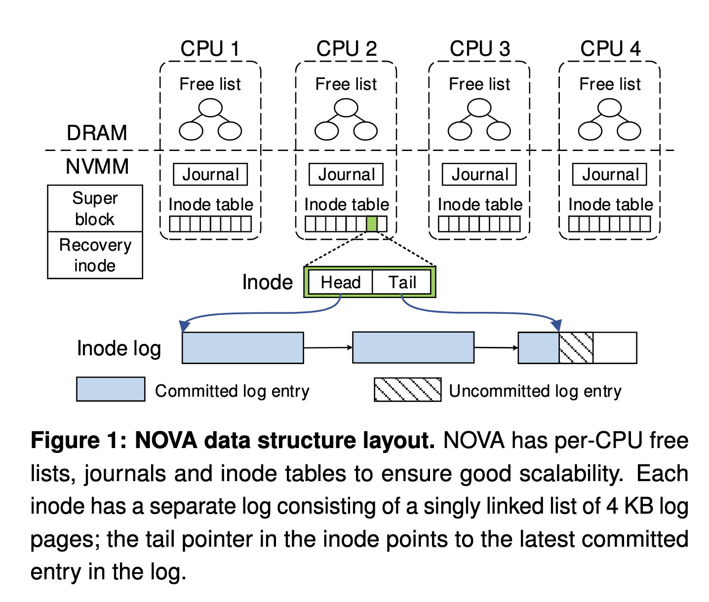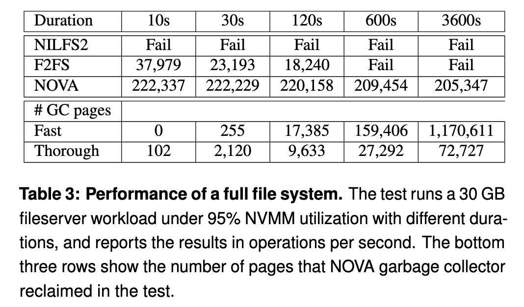 论文作者提出了一种名为 NOn- Volatile memory Accelerated (NOVA) 的日志结构文件系统 (log- structured file system, LFS) 以最大化 NVMM 和 DRAM 同时存在的混合存储系统的效率。
