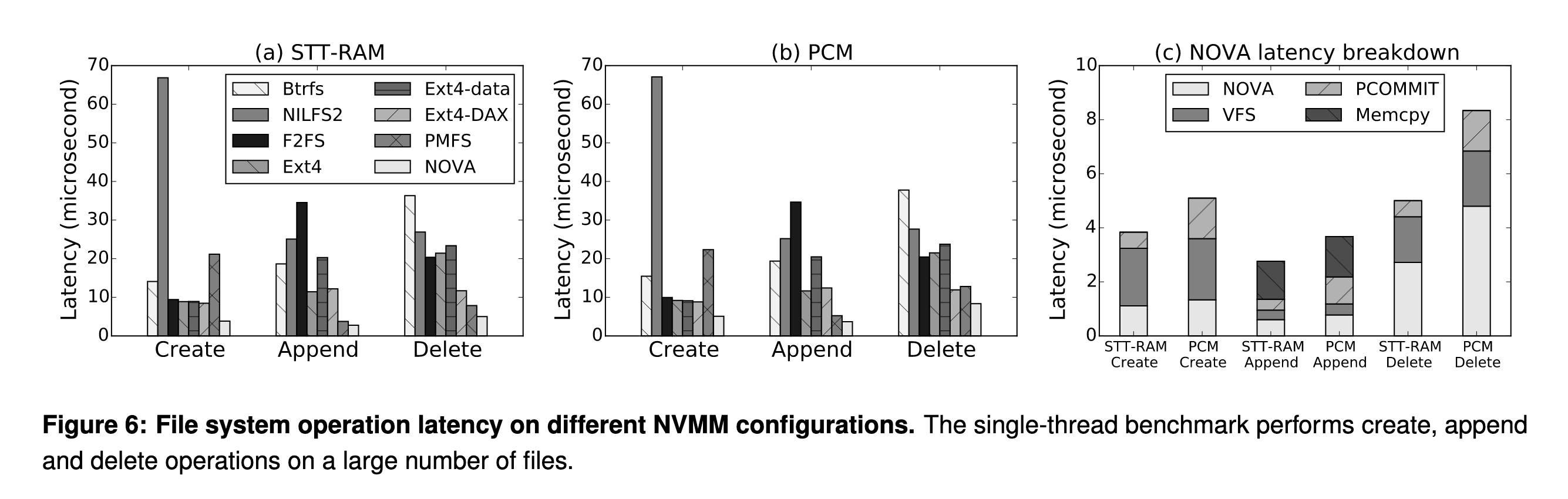 PCM(相变内存,二者均为 NVMM)上,其中 create 和