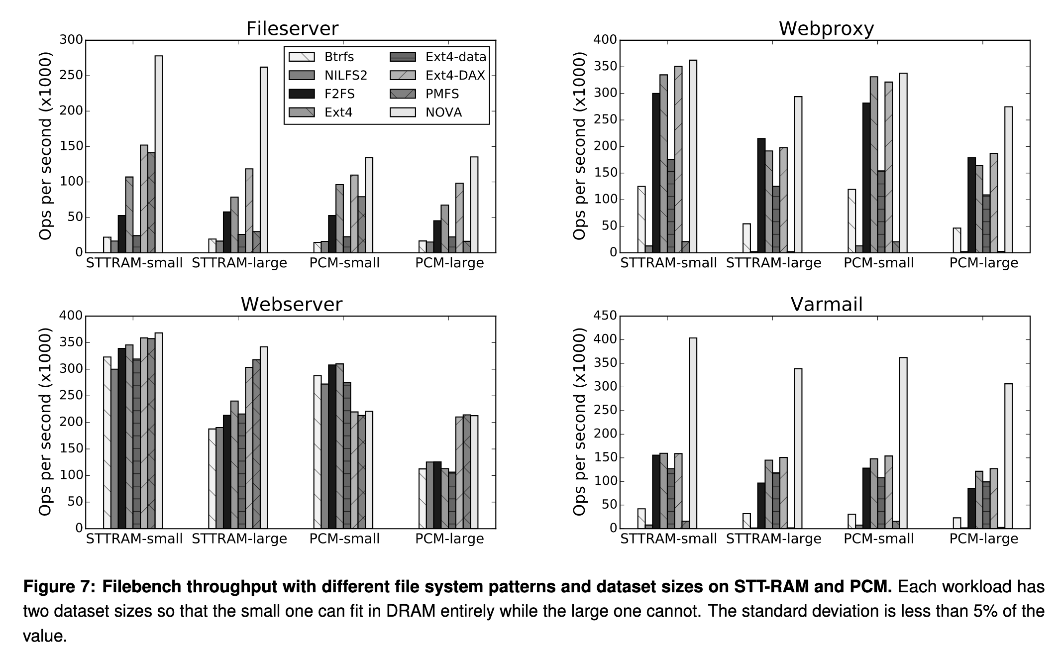 对于宏基准测试,作则测试了文件服务器、Web 代理、Web服务器、邮件服务器四种情况,NOVA 在文件服务器和邮件服务器这样写密集业务上的吞吐量均领先(NVMM 的特性规避了写放大),而在 Web Server 和 Web Proxy 这样读密集的业务上表现一般。