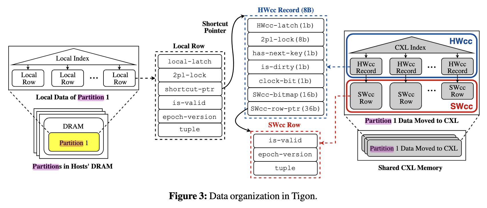 HWcc-latch: 数据库中对元组数据的 latch \(^{[1]}\), 防止多主机或多线程同时访问造成不一致性2pl-lock: 用于记录两阶段锁状态has-next-key: Next-Key Locking 的改进。由于 Next-Key Locking 需要锁住 next key 来避免幻读问题,而 CXL 共享内存可能并未加载这个 next key,所以通过这个标志位记录当前 CXL Index 的下一个 key 是不是在 Owner 那里时真实的下一个 key(因为 CXL 只加载 CAT,很可能当前 key 在 CXL Index 里的下一个 key 是其他的 CAT)。这个维护由 Owner 在获取 CXL Index B+ Tree 锁后修改索引时顺手维护,在 Next-Key Locking 时需要检查。若has-next-key为真则无需额外操作,否则需要从节点的 Local DRAM 里再加载到 CXL 内存中。is-dirty: 用于记录 CXL 内存中的数据是否被修改过(是否和 Owner Local DRAM 里的数据相同),如果未被修改则 Owner 访问时可以不读 SWcc 中的数据而是在 Local DRAM 中访问,节省 CXL 带宽。clock-bit: Tigon 采用 CLOCK 算法而不是 LRU 算法来管理 HWcc 中数据的进出。SWcc-bitmap: 缓存有效性位图,若当前主机对应的位是1则说明本地 CPU 缓存有效,否则则需要 flush,强制从 CXL 读取最新数据并重设位 1。当有主机需要更新 SWcc Row 时会清零所有缓存有效位,通知它们主机的本地缓存已经无效了。SWcc-row-ptr: 指向在 SWcc 中的 SWcc Row,这部分记录实际数据。