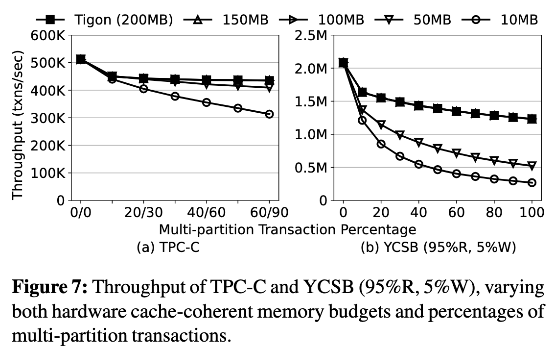传统的分布式数据库实现需要基于网络通信的两阶段提交,而 Tigon 只需要基于 CXL 链路的 CXL 原子操作即可。由于涉及跨主机访问的元组都在 CXL 内存中,单机就可以锁定所有资源、决定事务的提交与终止、写入日志等,极大便利了数据库实现,避免了 2PC 的开销。